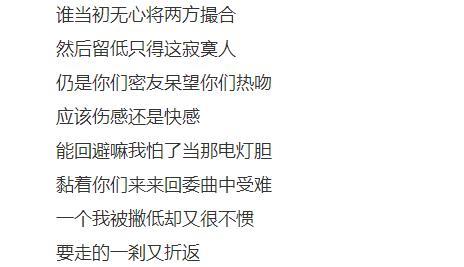 代表作《电灯胆》讲述的是三个人之间的关系。成全了另外两位的感情后,只留下孤独的自己。故有评论称:歌词高虐。