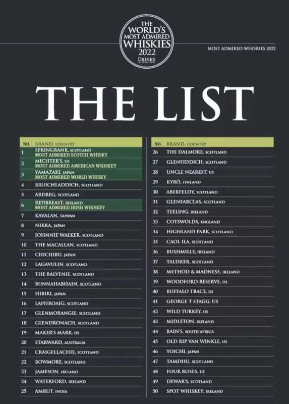 时隔一年,由国际权威酒饮杂志Drinks International评选的最受欢迎威士忌品牌榜单已出炉。