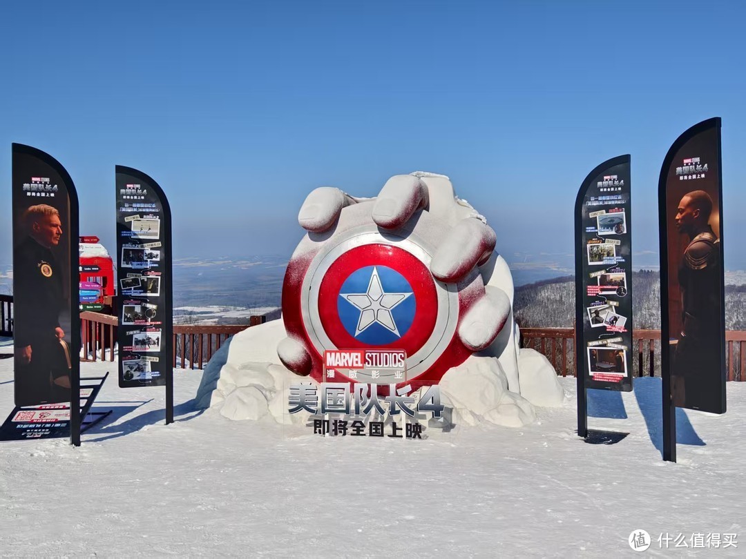 山顶上有几处可以留影的打卡点,比如《美国队长4》即将全国上映的预告,还有咖啡馆和餐厅。