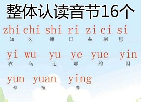 整体认读音节16个分别是zhi、chi、shi、ri、zi、ci、si、yi、wu、yu、ye、yue、yuan、yin、yun、ying。发音口形舌位不好掌握,把这16个音节当做整体来读。
