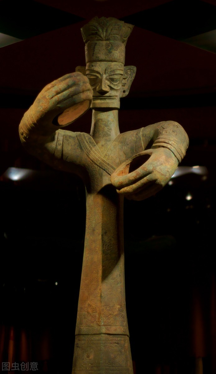 。青铜大立人高踞于群像之上,他既有王者之风,又有主神之仪,因此是群巫之长。其他人头像则代表着蜀王治下的各级统治者、各族之长或群巫。