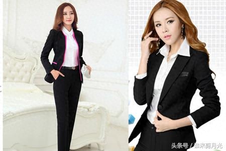 西服一直是很正式严肃的服饰,在面试这种重要的场合,西装是再合适不过的,而且西装不仅仅适合男士,很多女生在面试的时候也适合穿西装,如图一身黑色的西服套装看起来很职业,里面搭配白色的衬衫,衬衫领子可以放在里面,也可以像图二那样放在外面,也很时尚,如果你不知道面试穿什么,这套一定是不会错的。