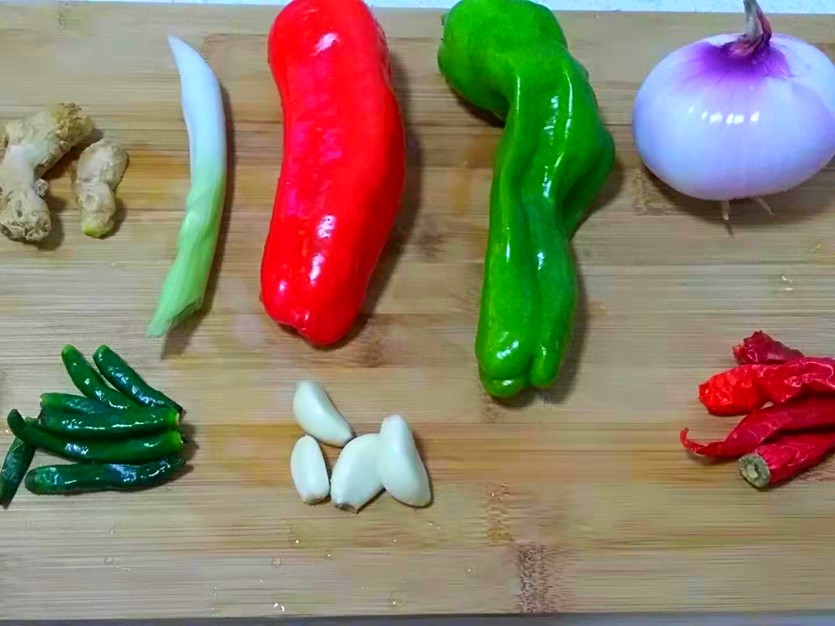 其他辅材:青红椒、葱姜蒜、洋葱、花椒、八角、胡椒粉、干红辣椒、小尖椒、料酒、生抽。