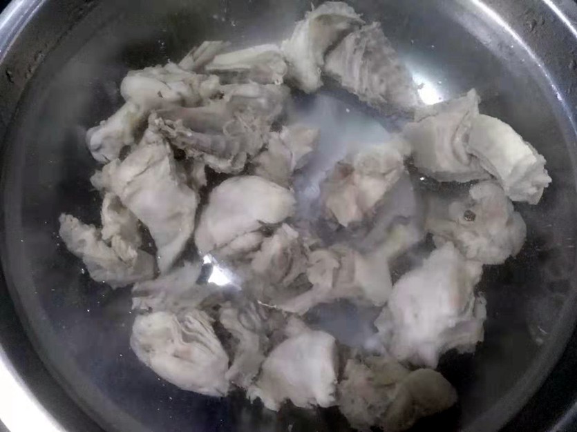2、撇去浮沫,略煮一会儿,然后捞出过冷水清洗干净备用。