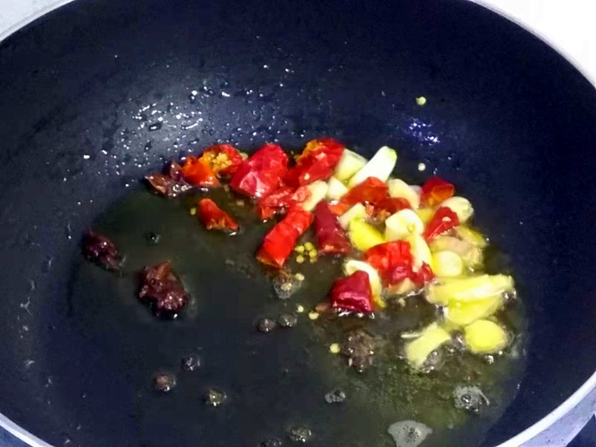 锅中放葱姜蒜花椒八角辣椒炝锅