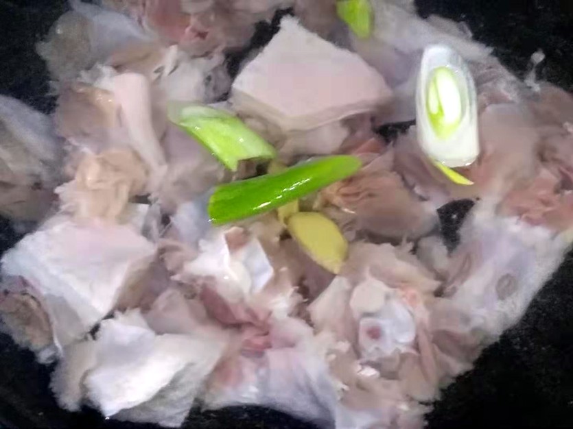 1、两遍清洗处理好的鸭腿肉冷水下锅,加花椒、八角、葱段姜片、料酒烧开。