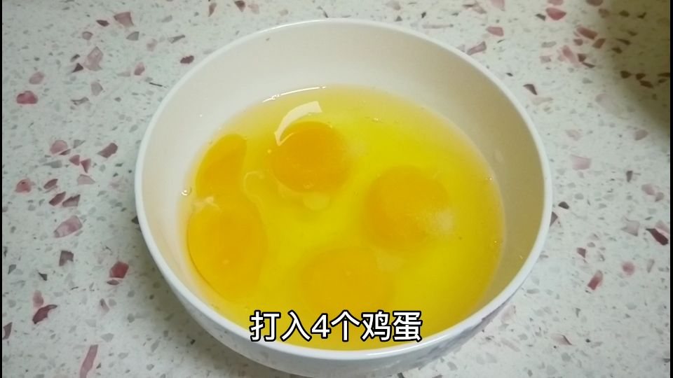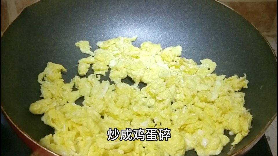 锅里烧油把鸡蛋炒成鸡蛋碎,喜欢吃特别碎的,就多搅动几下,