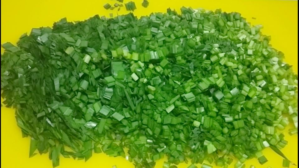 然后把鸡蛋碎炒好捞出放凉。韭菜洗干净,切成小段,