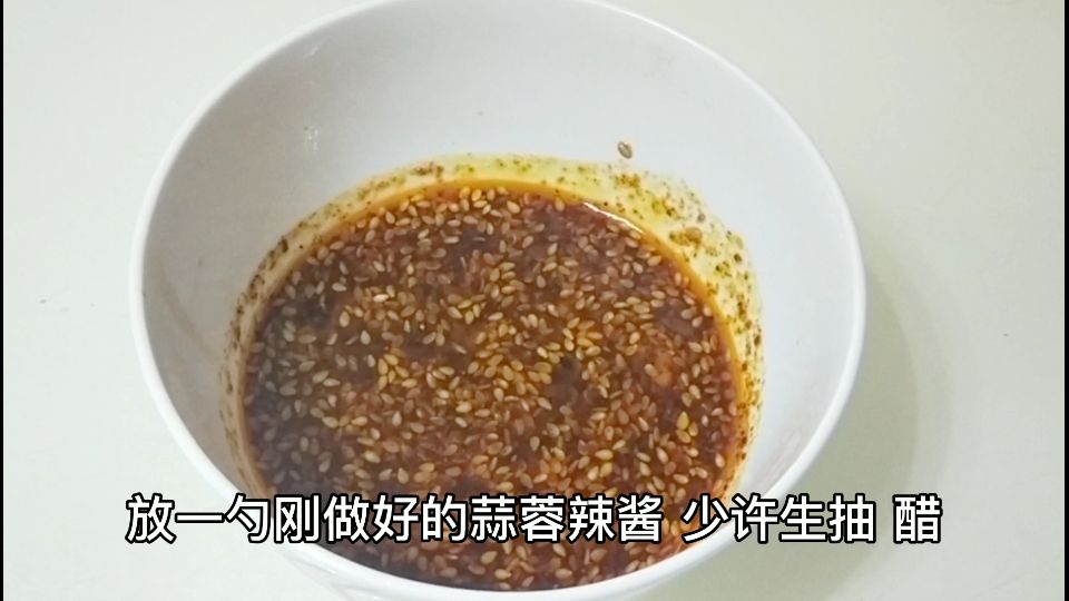 小碗里放一勺刚做好的蒜蓉辣酱,倒少许的生抽和酱油,搅一下,