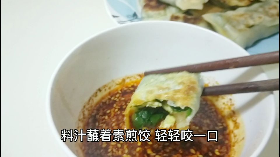 煎饺的蘸料就做好了。刚出锅的素煎饺蘸一下这个料汁轻轻咬一口,