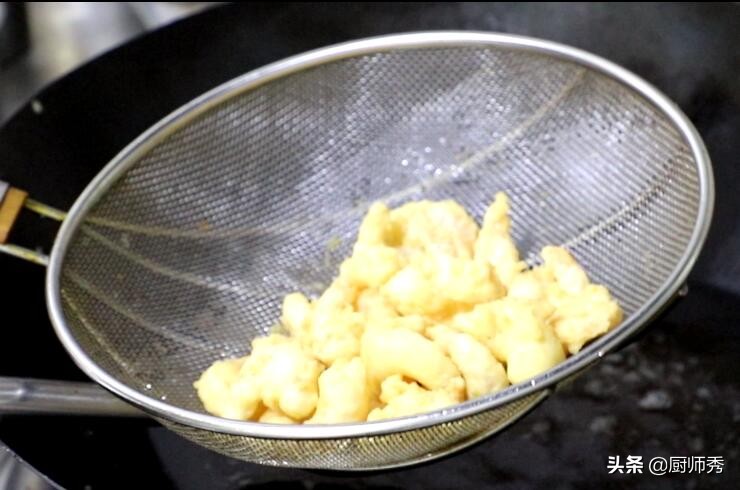 3、锅内加植物油五成油温下虾仁,虾仁要一个一个下入防止粘连,用笊篱打去碎渣,炸至微黄色捞出,等待油温升至180度,倒入重油,炸制虾球金黄倒出控油。