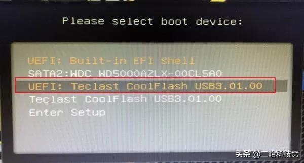 2.在键盘上按上下方向键「↑↓」选择U盘(选项有显示USB或U盘品牌英文名称),我这里选择「UEFI:Teclast CoolFlash USB3.0」,按「Enter」键后电脑进入PE。