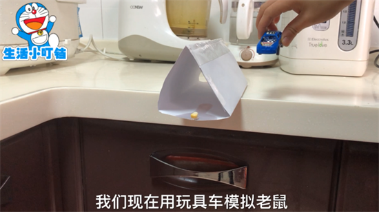 我们把三角形通道放在厨房,老鼠常出没的地方,在通道下放一个深一些的水桶,我们现在用玩具车模拟老鼠,老鼠钻进纸里想吃玉米,就会掉进深桶里,一抓一个准效果非常的好,老鼠掉进深桶里就爬不出来了。
