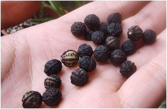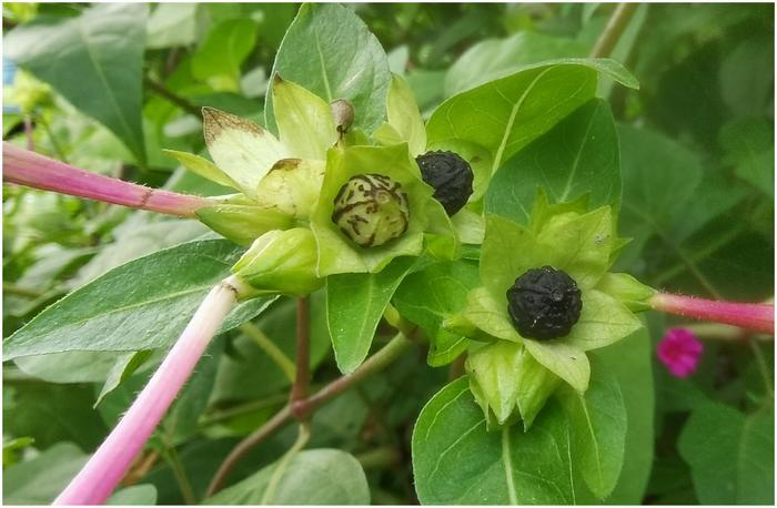 胭脂花的种子呈卵圆形、黑色、表面斑纹褶皱、外形像个小地雷,剥去种皮,内里胚乳则是白色。干燥后,用手指一碾即成白色粉末,这白色的粉末便是那古时上等的化妆品,其有白皙透红的化妆效果,当然在现在社会中有很多价值,能解决女性朋友脸上的烦恼,具体有用途我会在评论区给大家打出来。